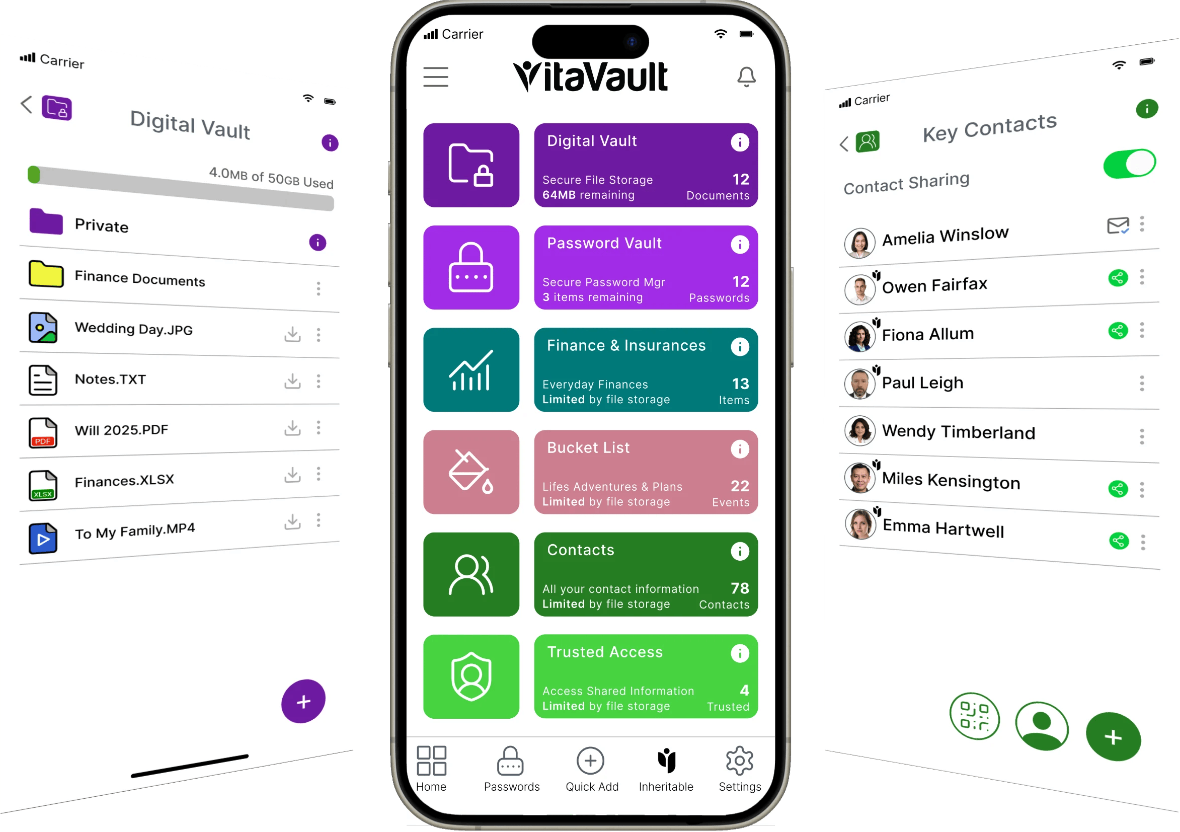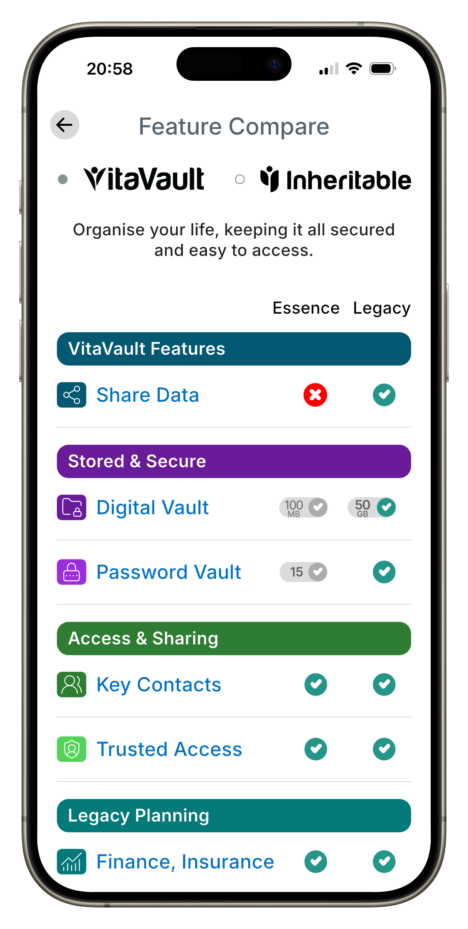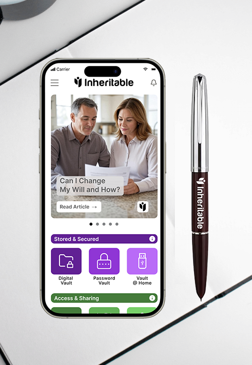 VitaVault is powered by Inheritable - the UK's leading life planning platform. Sign up once and you get access to both. Every document, password, and piece of information you store in VitaVault is instantly available in Inheritable. As your needs grow, Inheritable gives you tools for wills, estate planning, legacy messages, and more - all without ever re-entering your data.